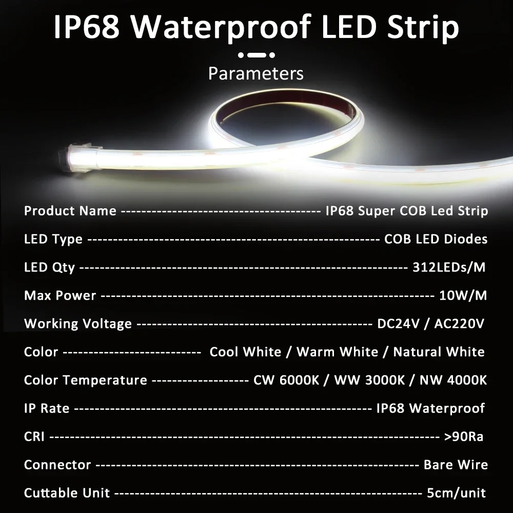 Super COB LED Strip Light IP68 Waterproof DC24V AC220V High Quality Underwater Outdoor Flexible Tape 312Leds/M Ribbon for Pool
