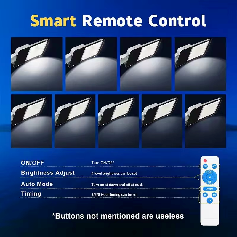 Accessories: remote control, installation screws, instruction manual, lighting fixture, solar panel. Installation bracket