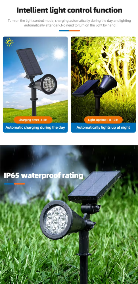 When using it for the first time, it is necessary to press and hold the "ON" button in sufficient sunlight to turn on the light for charging. Please note that when the light is turned of, it will not continue charging!Please note that solar energy can only be lit in dark environments. During the day,you can place the solar panel facing down on the table to ensure that the panel can not see light, the lights are lit, and it can be charged when placed in sunlight.